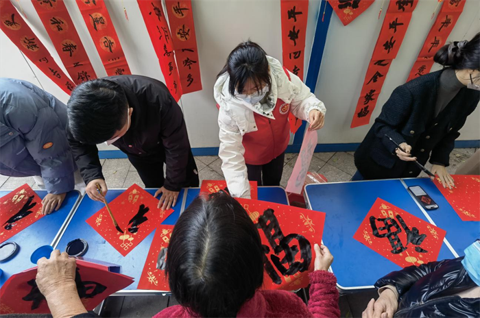 活动现场,红纸翻飞,翰墨飘香,星空(中国)师生挥毫泼墨,抒写美好与祝福。社区居民围拢而来,挑选心仪的春联,个个春风满面,喜笑颜开。
