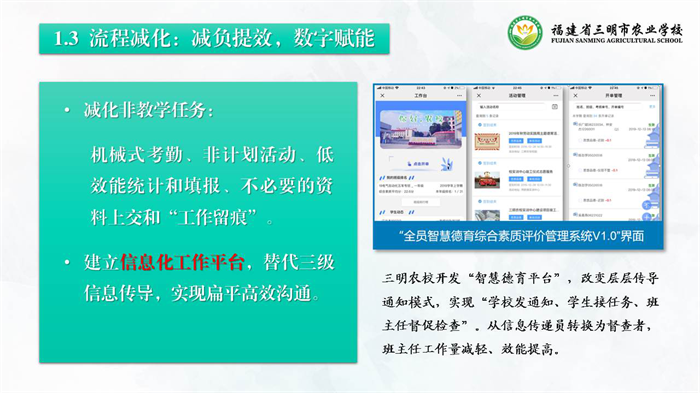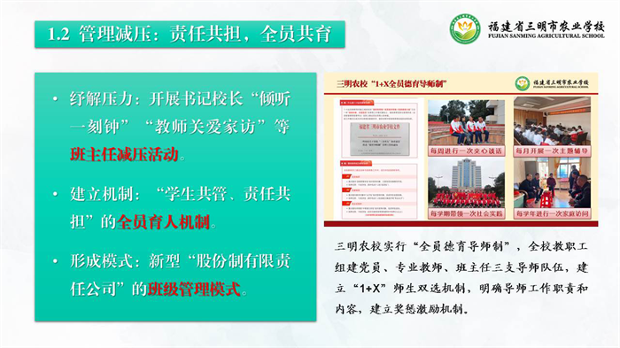 论坛上,我校思政处主任林宏宇以《减负、增能、赋权——优化中职班主任工作的学校路径》为题作主旨发言。他从学校管理视角,提出通过减负、增能和赋权等方法,让班主任有位、善为,助力班主任管理。通过聚焦主责,配好帮手,实现工作减量;通过人文关怀、全员共育,实现管理减压;通过减少留痕,数字赋能,实现流程减化。从思政增能,让班主任有位;从管理增能,促班主任善为;从团队增能,助班主任发展。从团队、责任、目标三个方面实现班级建设召集权、班级管理自主权和职级晋升发展权。