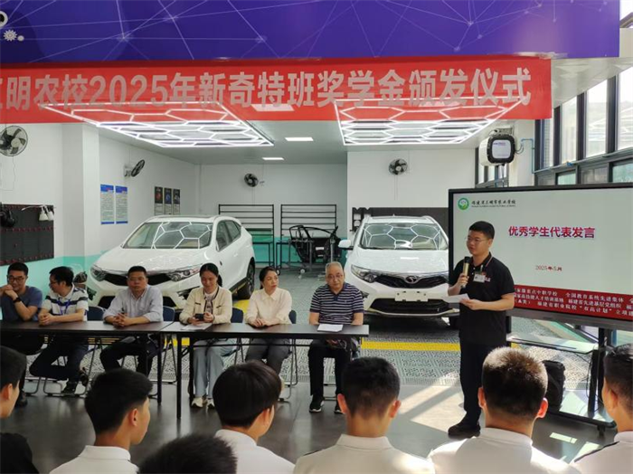 汽车专业优秀学生代表林代有同学对学校和新奇特车业提供的平台表示衷心感谢。表示这一平台为同学们敞开了职业探索的大门,使他们的成长之路更加明确。最后,他代表同学们承诺,未来将致力于在实践中积累宝贵经验,致力于成为新时代中“精通技术、勇于担当”的技能型人才,立志在汽车服务行业贡献自己的力量,用青春和汗水践行劳动光荣、技能宝贵的新风尚。