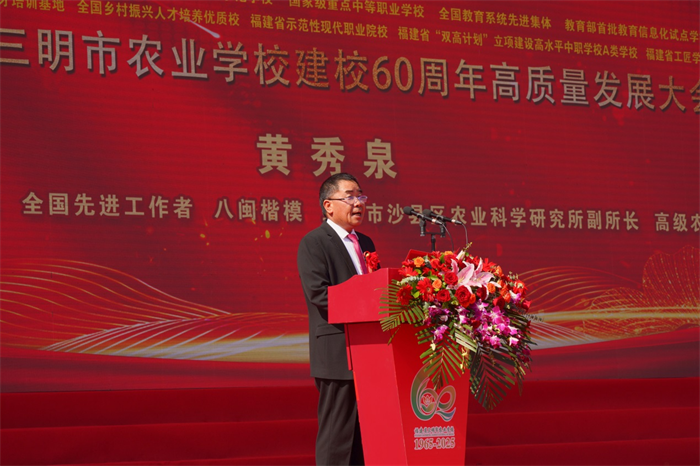 全国优秀共产党员、八闽楷模、校友代表黄秀泉以四十载坚守献礼母校。他身患尿毒症、两度移植肾脏,仍以“活着一天,奋斗一天”的信念扎根田间,完成5000余项水稻试验。他用生命诠释着母校的教诲——“农业是良心活,一粒种子关系千万家”,彰显着学校薪火相传的精神之魂。